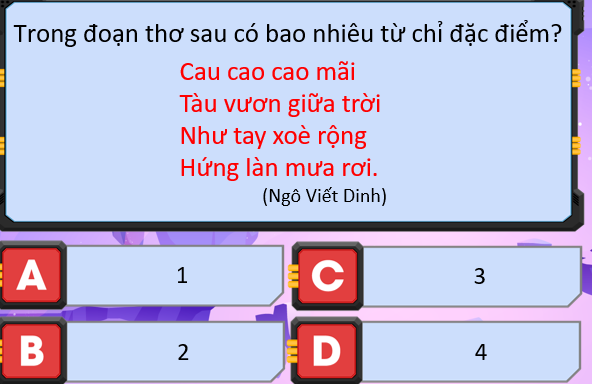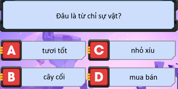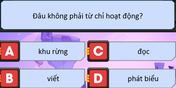 Giải thích: A, C: từ chỉ đặc điểm; D. từ chỉ hoạt động