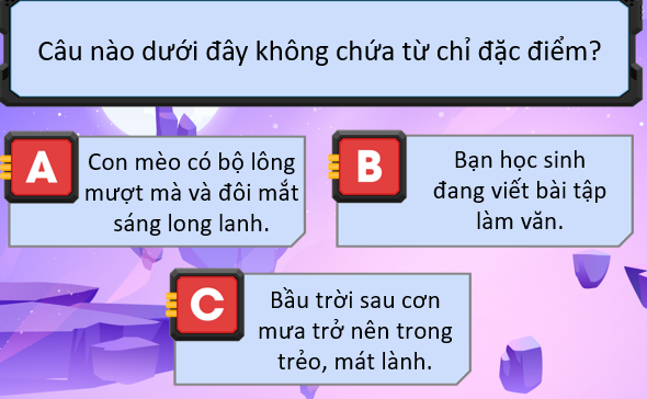 Giải thích: A. mượt mà, sáng long lanh (từ chỉ đặc điểm); C. trong trẻo, mát lành (từ chỉ đặc điểm)