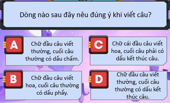 Đáp án: C. Chữ cái đầu câu viết hoa, cuối câu phải có dấu kết thúc câu.