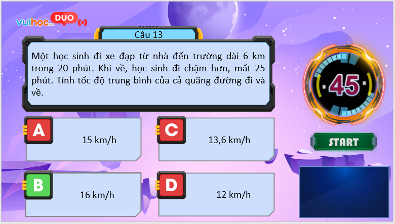 Tốc độ trung bình là: $\frac{6+6}{20+25}=\frac{4}{15}$ (km/phút) = 16 km/h
