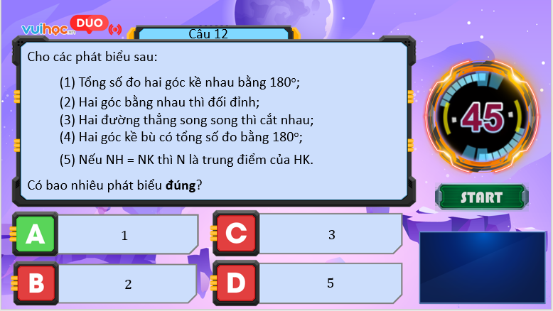 (2) Hai bằng nhau thì đối đỉnh. Đây là phát biểu sai.