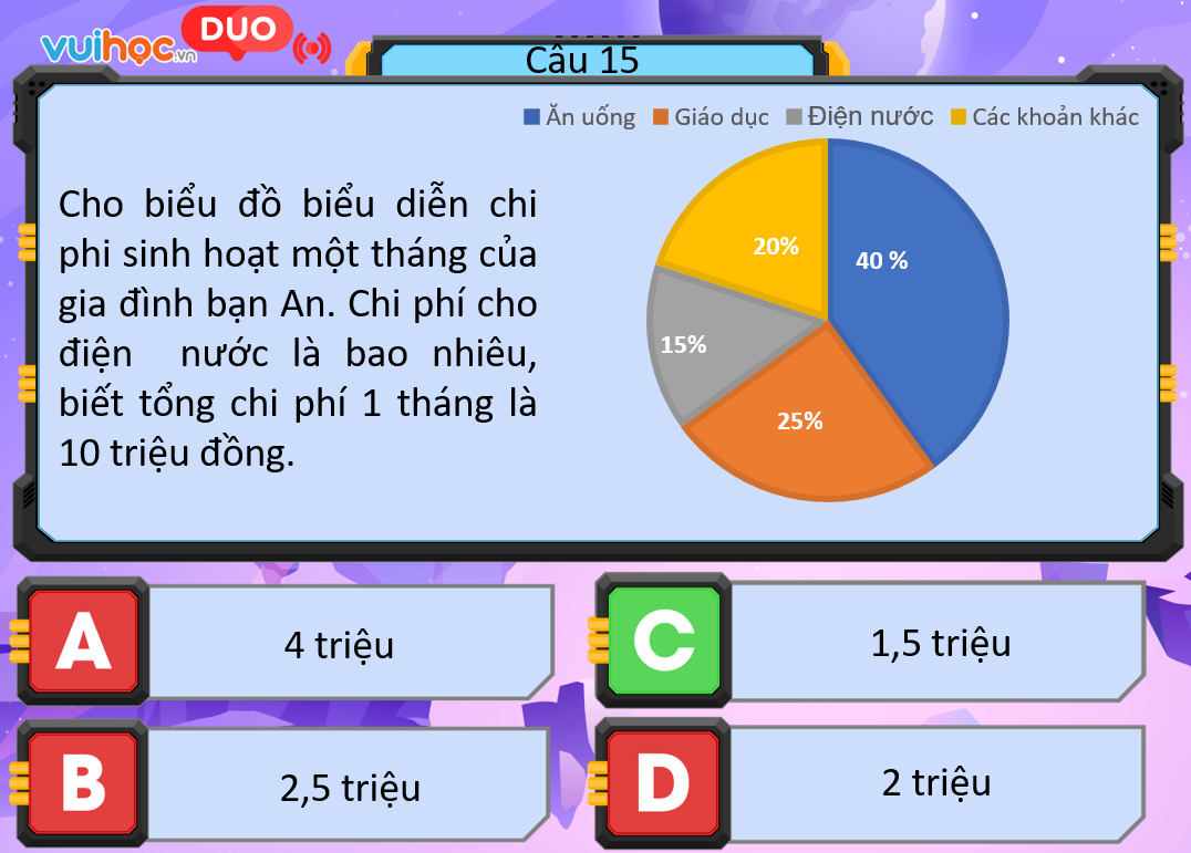 Số tiền dành cho điện nước là: $\frac{10.15}{100}$ = 1,5 triệu đồng.